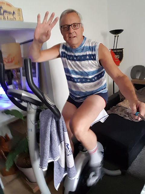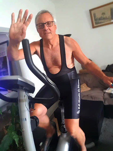 Depuis fin mars il refait sur son vélo d’appartement (prêté par son voisin Bruno) toutes les étapes du tour de France rediffusées sur des chaines de télévision.